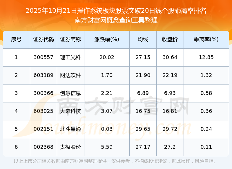 2025年10月21日操作系統(tǒng)板塊股票突破20日線個(gè)股乖離率排名