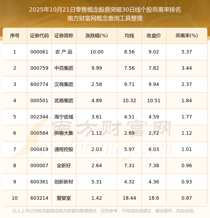 2025年10月21日零售概念股票突破30日線個股乖離率排名