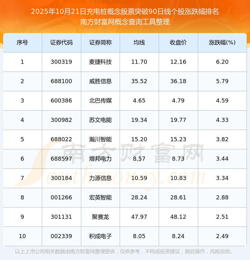2025年10月21日充電樁概念股票突破90日線個(gè)股漲跌幅排名