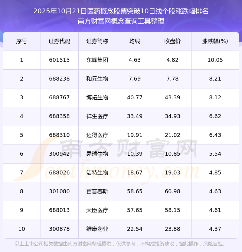 2025年10月21日醫(yī)藥概念股票突破10日線個(gè)股漲跌幅排名