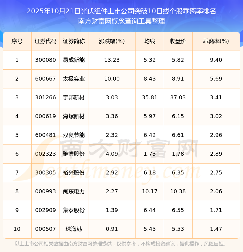 2025年10月21日光伏組件上市公司突破10日線個(gè)股乖離率排名
