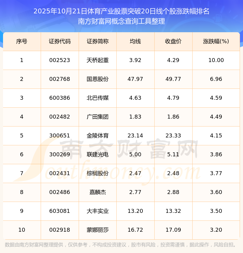 根據(jù)南方財(cái)富網(wǎng)概念查詢工具數(shù)據(jù)統(tǒng)計(jì),截止2025年10月21日收盤,體育產(chǎn)業(yè)股票共有29只個(gè)股收盤價(jià)向上突破了20日線。其中漲幅較大的個(gè)股有天橋起重、國恩股份、北巴傳媒等,漲幅分別為10.00%、6.96%、4.59%。