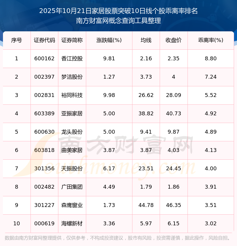 根據(jù)南方財富網(wǎng)概念查詢工具數(shù)據(jù)統(tǒng)計,截止2025年10月21日收盤,家居股票共有49只個股收盤價向上突破了10日線。其中乖離率較大的個股有香江控股、夢潔股份、裕同科技等,乖離率分別為8.80%、7.24%、5.52%。