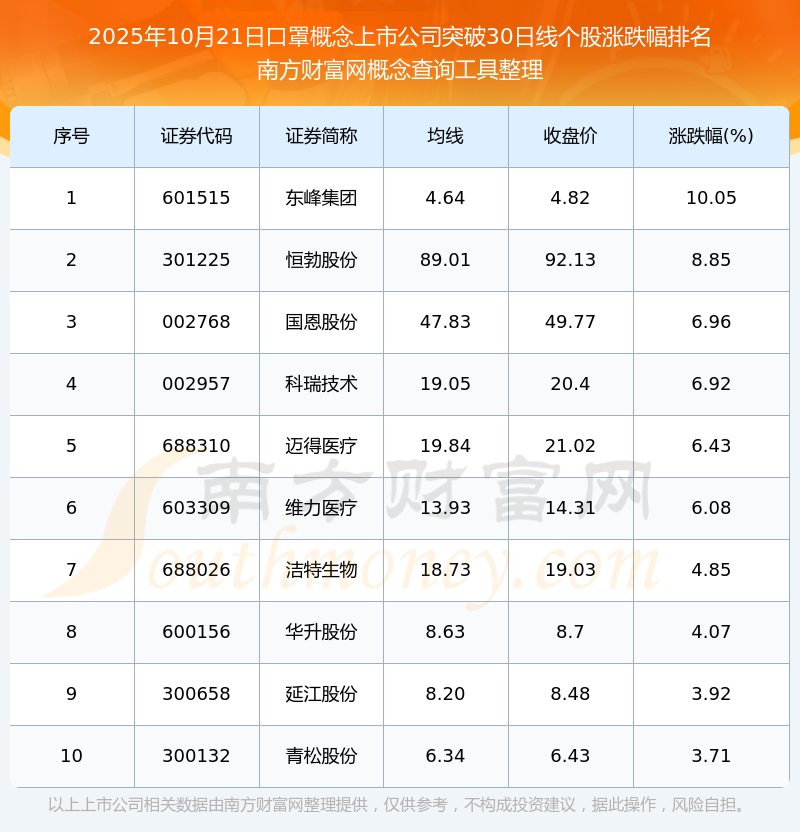 2025年10月21日口罩概念上市公司突破30日線個(gè)股漲跌幅排名