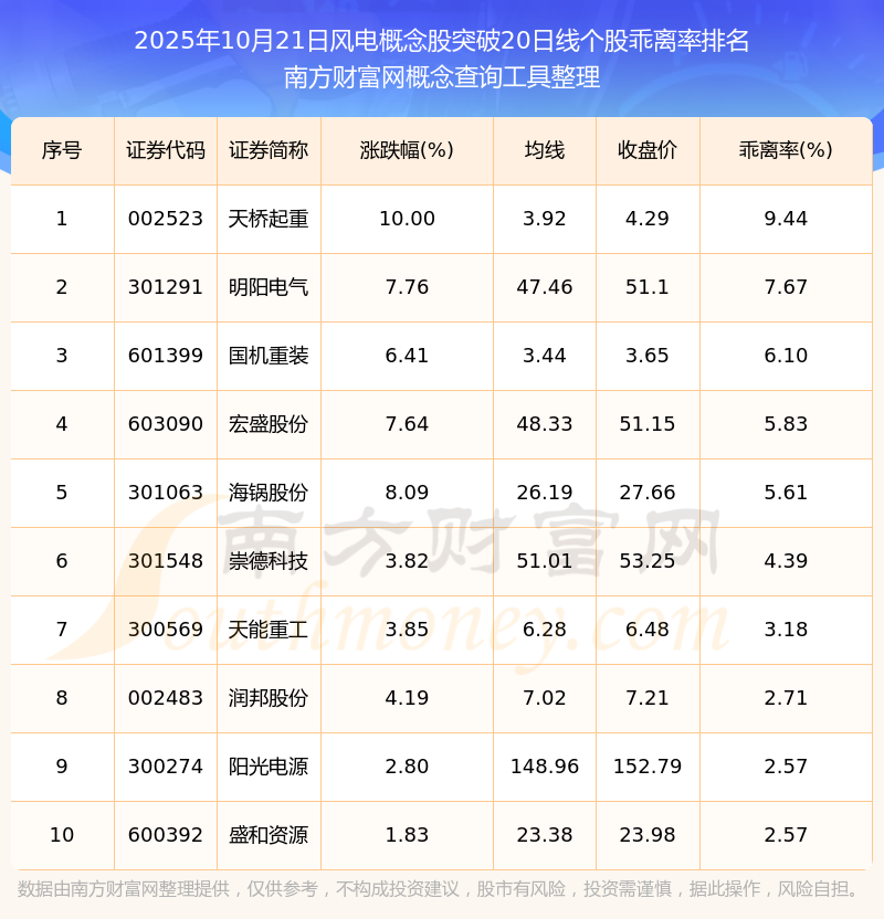 根據(jù)南方財富網(wǎng)概念查詢工具數(shù)據(jù)統(tǒng)計,截止2025年10月21日收盤,風電概念股共有57只個股收盤價向上突破了20日線。其中乖離率較大的個股有天橋起重、明陽電氣、國機重裝等,乖離率分別為9.44%、7.67%、6.10%。