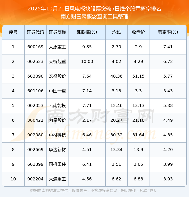 2025年10月21日風(fēng)電板塊股票突破5日線個股乖離率排名