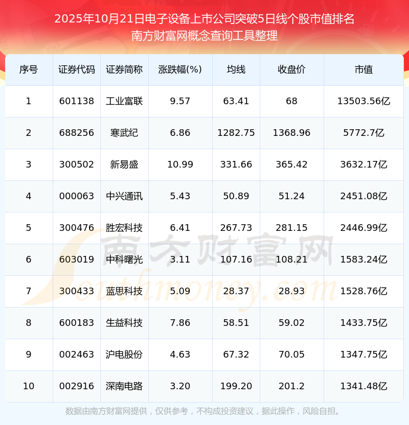 2025年10月21日電子設(shè)備上市公司突破5日線個股市值排名