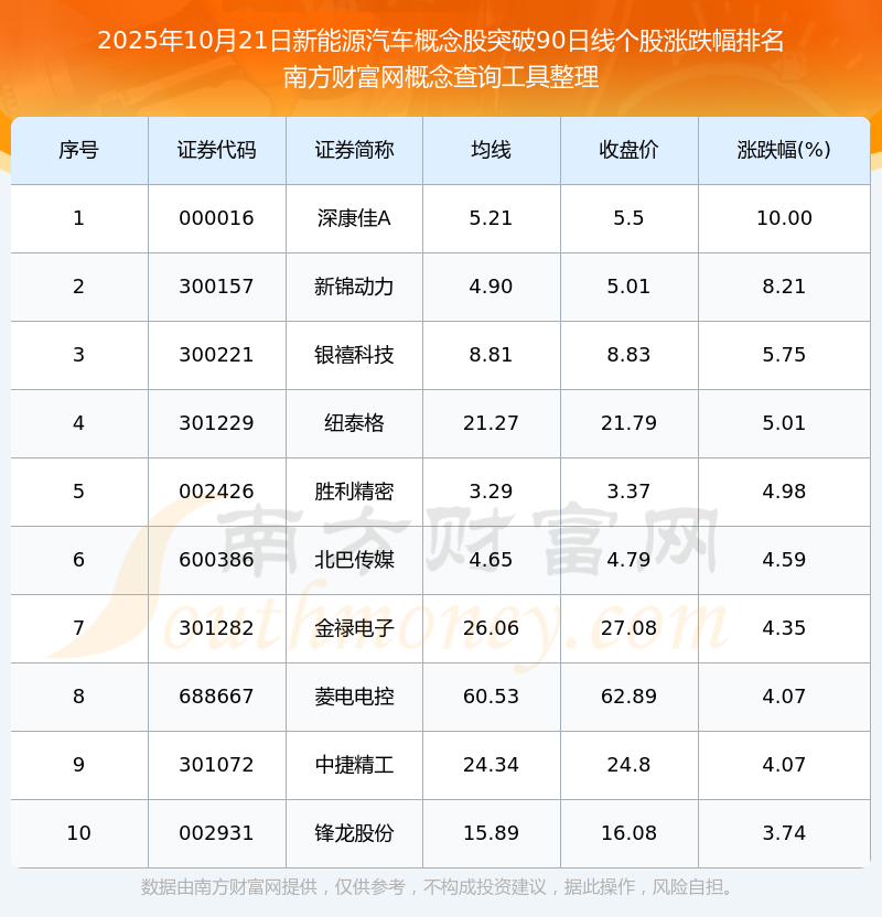 2025年10月21日新能源汽車概念股突破90日線個股漲跌幅排名