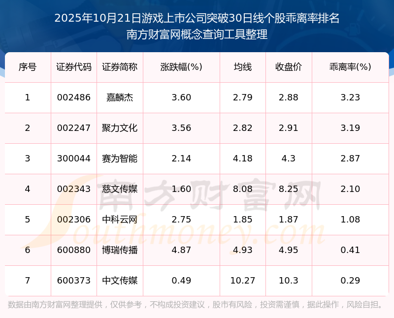 2025年10月21日游戲上市公司突破30日線個(gè)股乖離率排名
