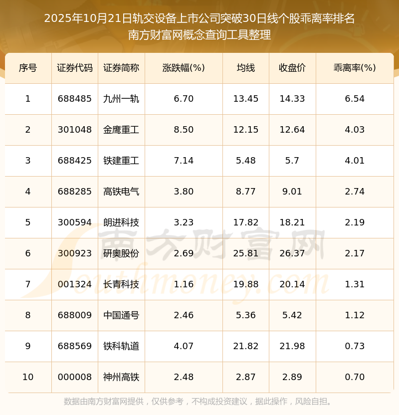 2025年10月21日軌交設(shè)備上市公司突破30日線個股乖離率排名