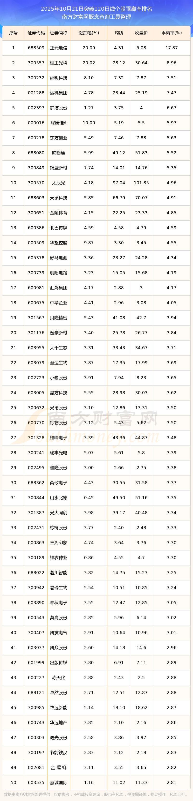 2025年10月21日突破120日線個(gè)股乖離率排名