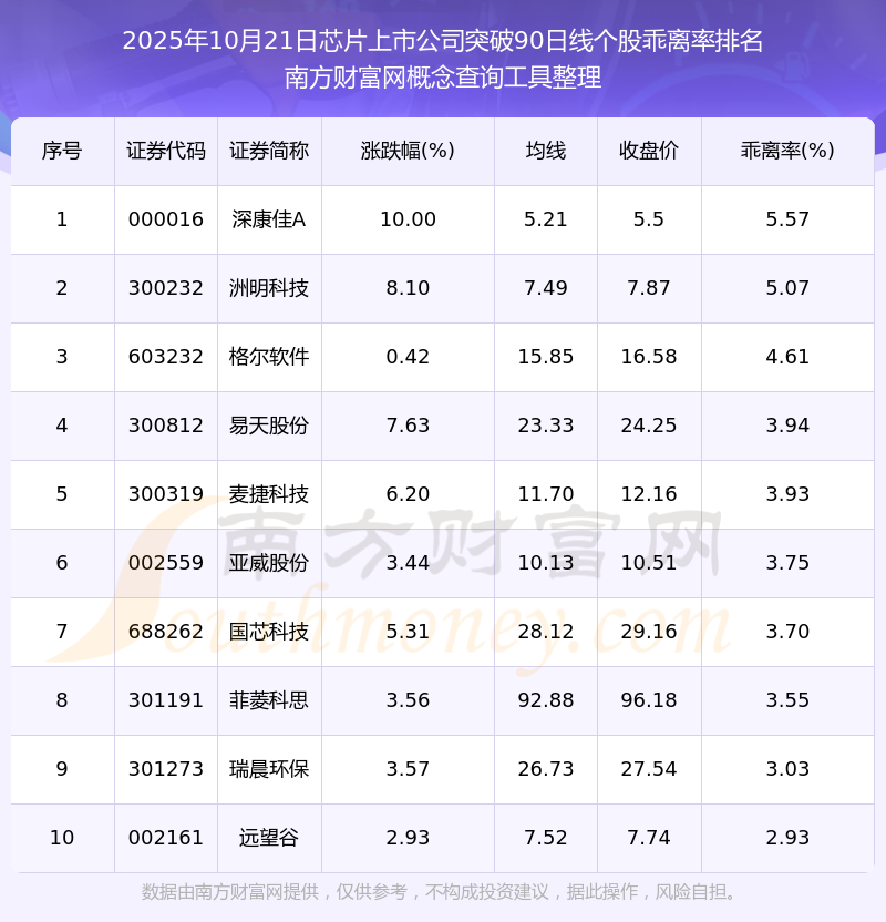 根據(jù)南方財富網(wǎng)概念查詢工具數(shù)據(jù)統(tǒng)計,截止2025年10月21日收盤,芯片上市公司共有67只個股收盤價向上突破了90日線。其中乖離率較大的個股有深康佳A、洲明科技、格爾軟件等,乖離率分別為5.57%、5.07%、4.61%。