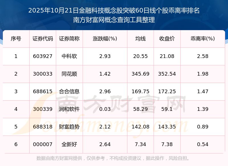 根據(jù)南方財富網(wǎng)概念查詢工具數(shù)據(jù)統(tǒng)計,截止2025年10月21日收盤,金融科技概念股共有6只個股收盤價向上突破了60日線。其中乖離率較大的個股有中科軟、同花順、合合信息等,乖離率分別為2.58%、1.98%、1.47%。
