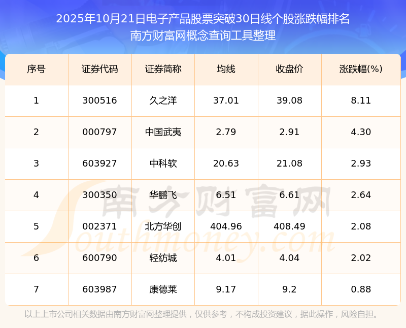 2025年10月21日電子產(chǎn)品股票突破30日線個股漲跌幅排名