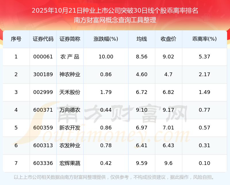 2025年10月21日種業(yè)上市公司突破30日線個股乖離率排名