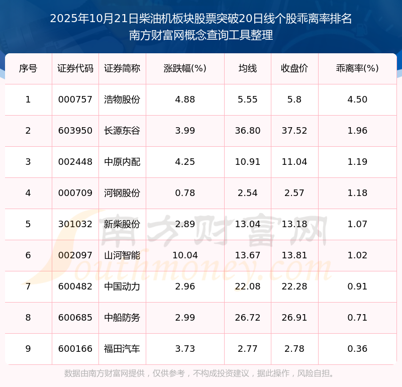 2025年10月21日柴油機(jī)板塊股票突破20日線個(gè)股乖離率排名