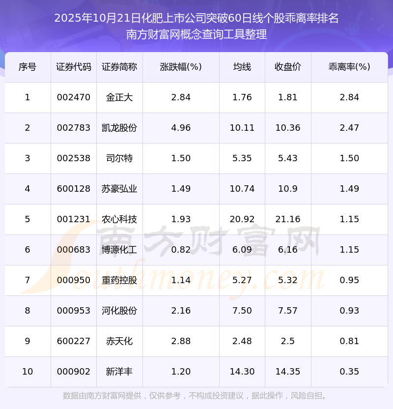 根據(jù)南方財富網(wǎng)概念查詢工具數(shù)據(jù)統(tǒng)計,截止2025年10月21日收盤,化肥上市公司共有10只個股收盤價向上突破了60日線。其中乖離率較大的個股有金正大、凱龍股份、司爾特等,乖離率分別為2.84%、2.47%、1.50%。