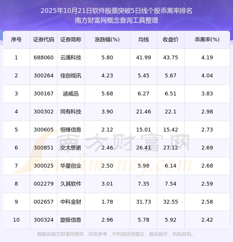 2025年10月21日軟件股票突破5日線個(gè)股乖離率排名