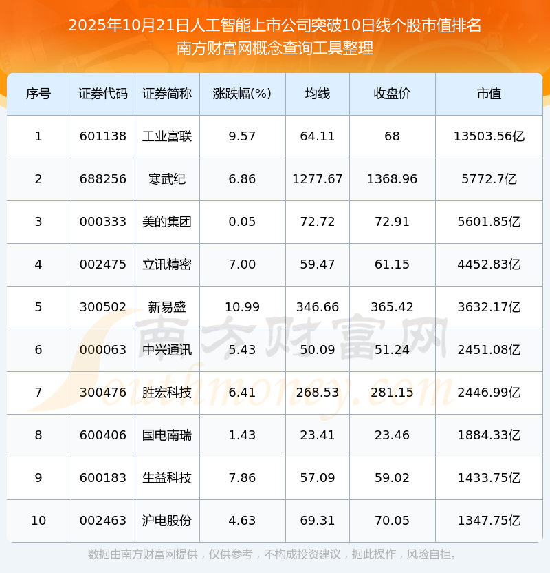 2025年10月21日人工智能上市公司突破10日線個股市值排名
