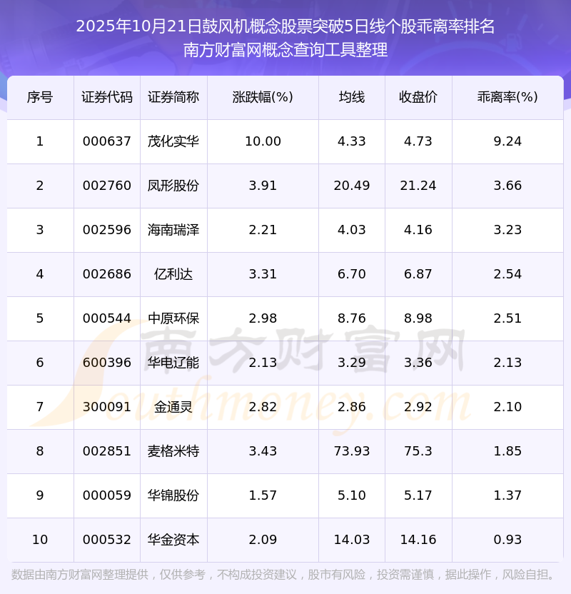2025年10月21日鼓風機概念股票突破5日線個股乖離率排名
