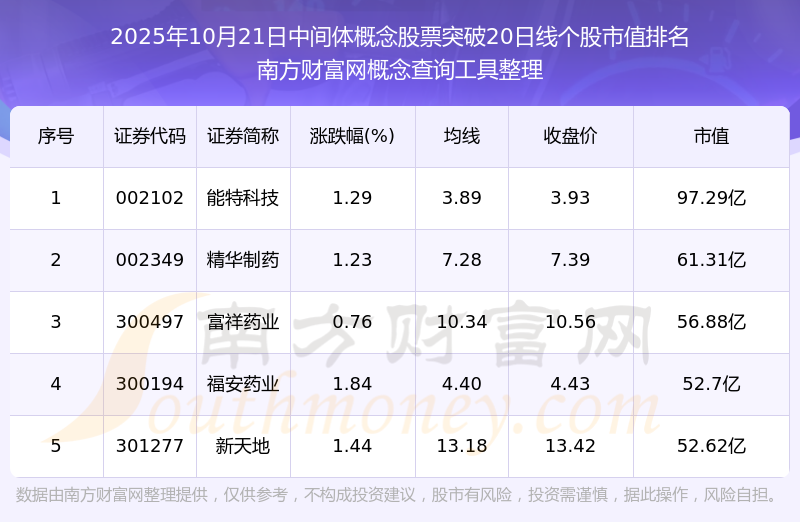 2025年10月21日中間體概念股票突破20日線個股市值排名