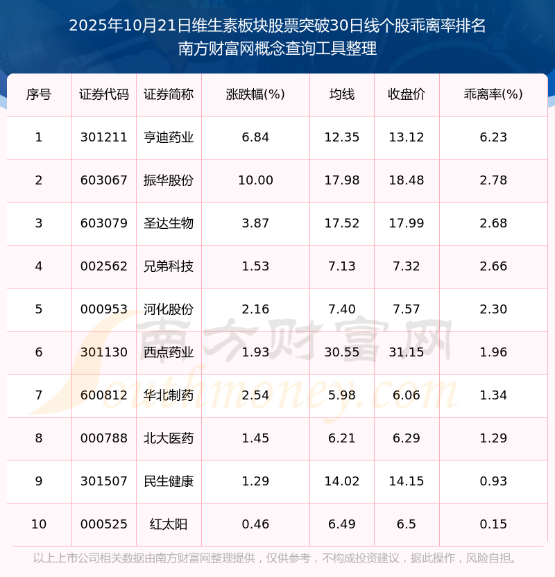 根據南方財富網概念查詢工具數據統(tǒng)計,截止2025年10月21日收盤,維生素板塊股票共有10只個股收盤價向上突破了30日線。其中乖離率較大的個股有亨迪藥業(yè)、振華股份、圣達生物等,乖離率分別為6.23%、2.78%、2.68%。