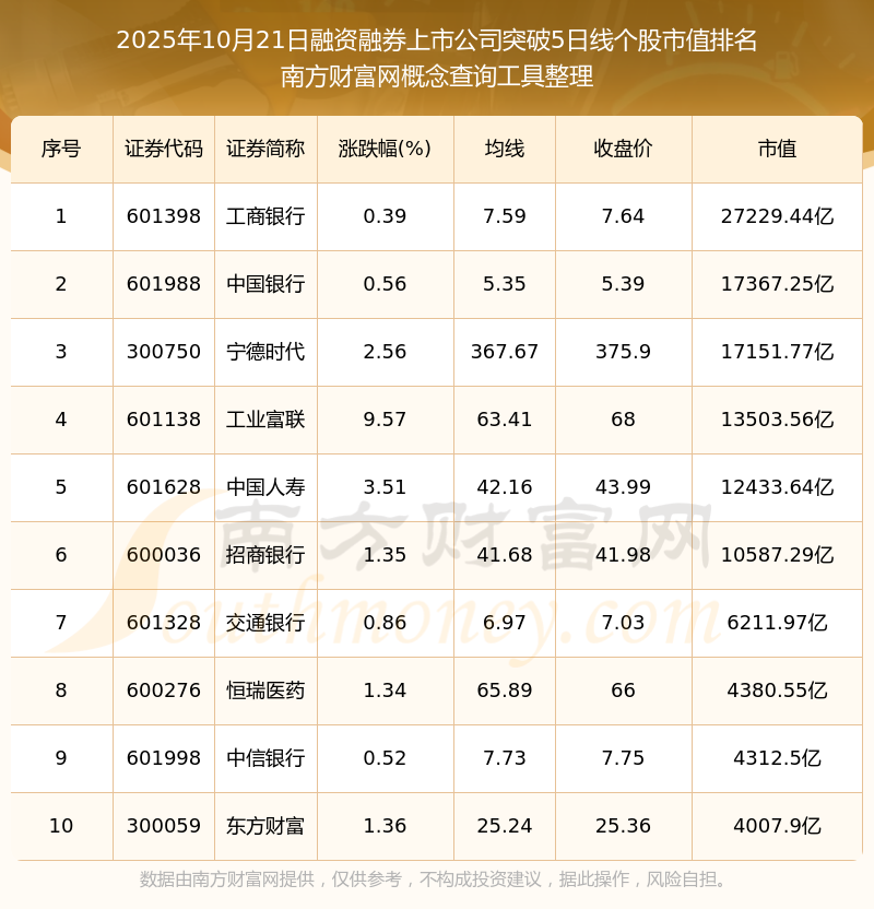 2025年10月21日融資融券上市公司突破5日線個股市值排名