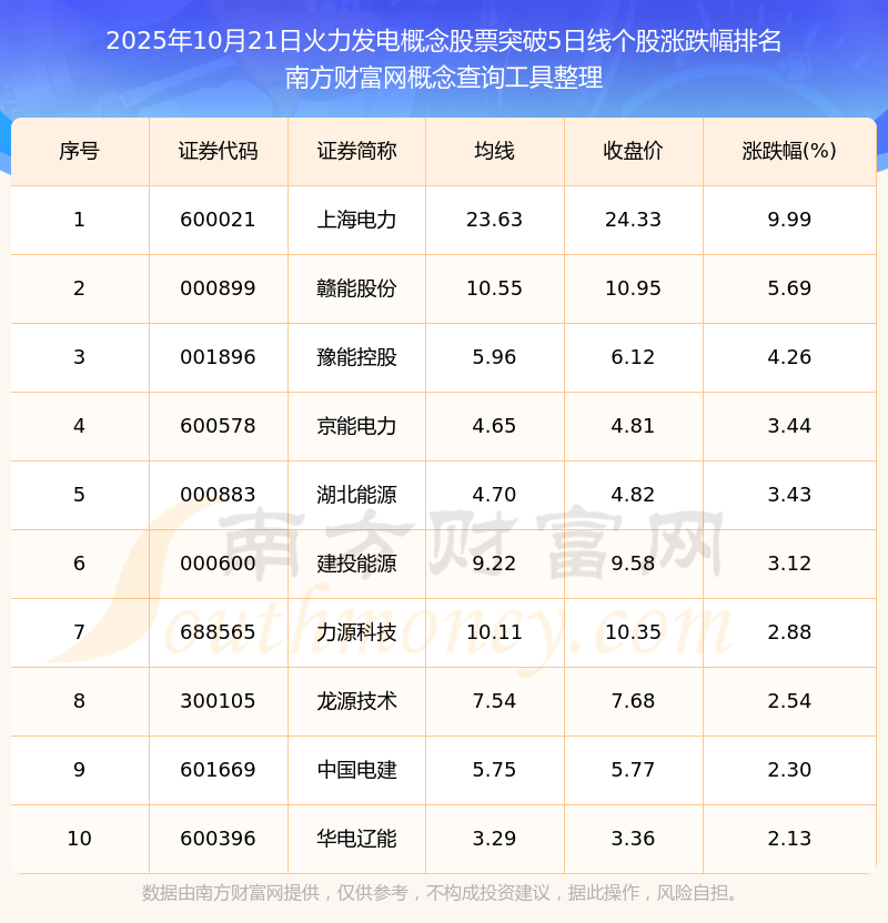 2025年10月21日火力發(fā)電概念股票突破5日線個股漲跌幅排名