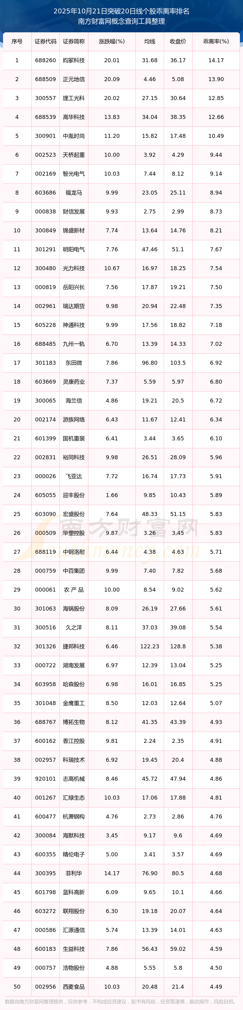 2025年10月21日突破20日線個(gè)股乖離率排名