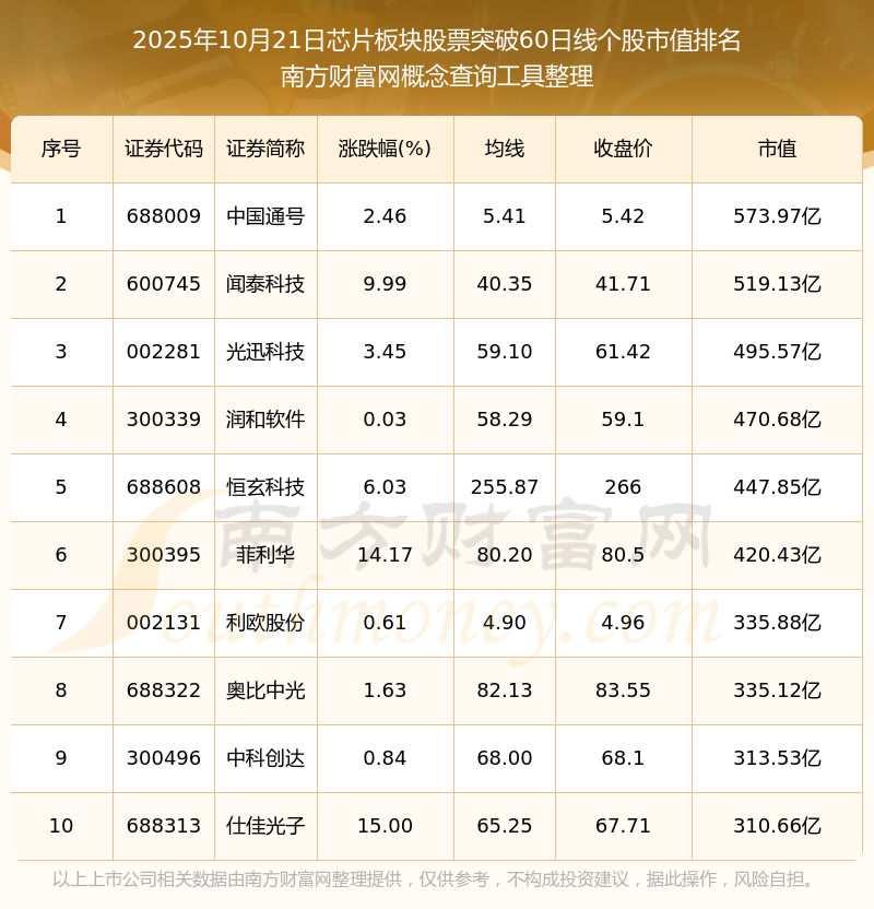 2025年10月21日芯片板塊股票突破60日線個股市值排名