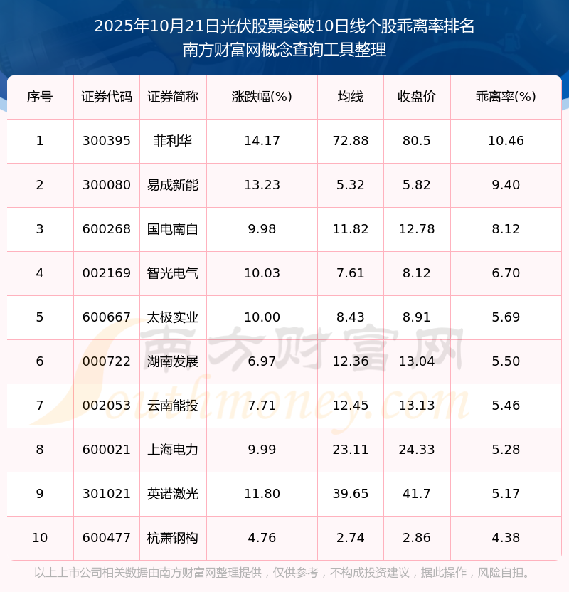 根據(jù)南方財富網(wǎng)概念查詢工具數(shù)據(jù)統(tǒng)計,截止2025年10月21日收盤,光伏股票共有128只個股收盤價向上突破了10日線。其中乖離率較大的個股有菲利華、易成新能、國電南自等,乖離率分別為10.46%、9.40%、8.12%。