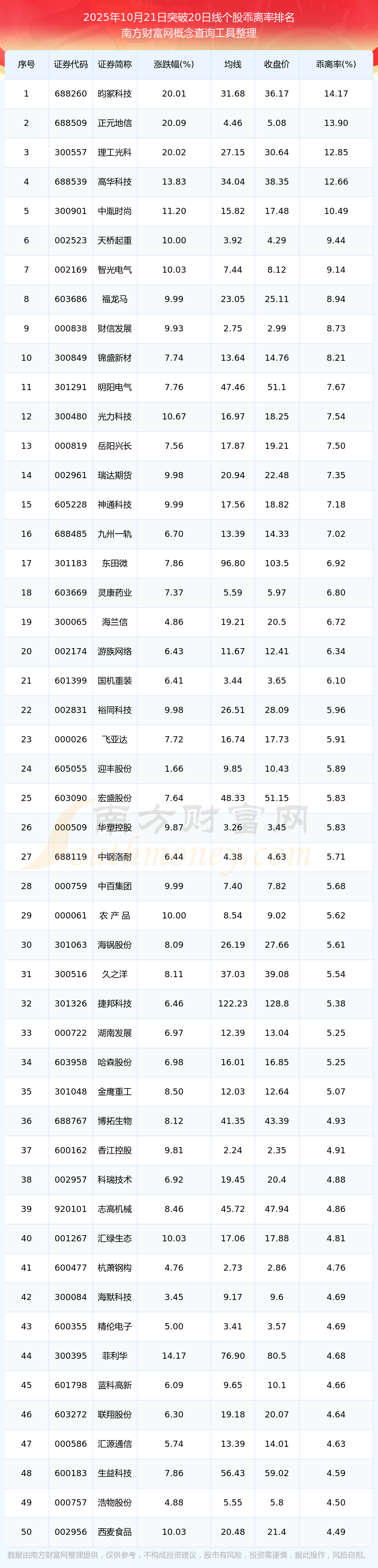 2025年10月21日突破20日線個(gè)股乖離率排名