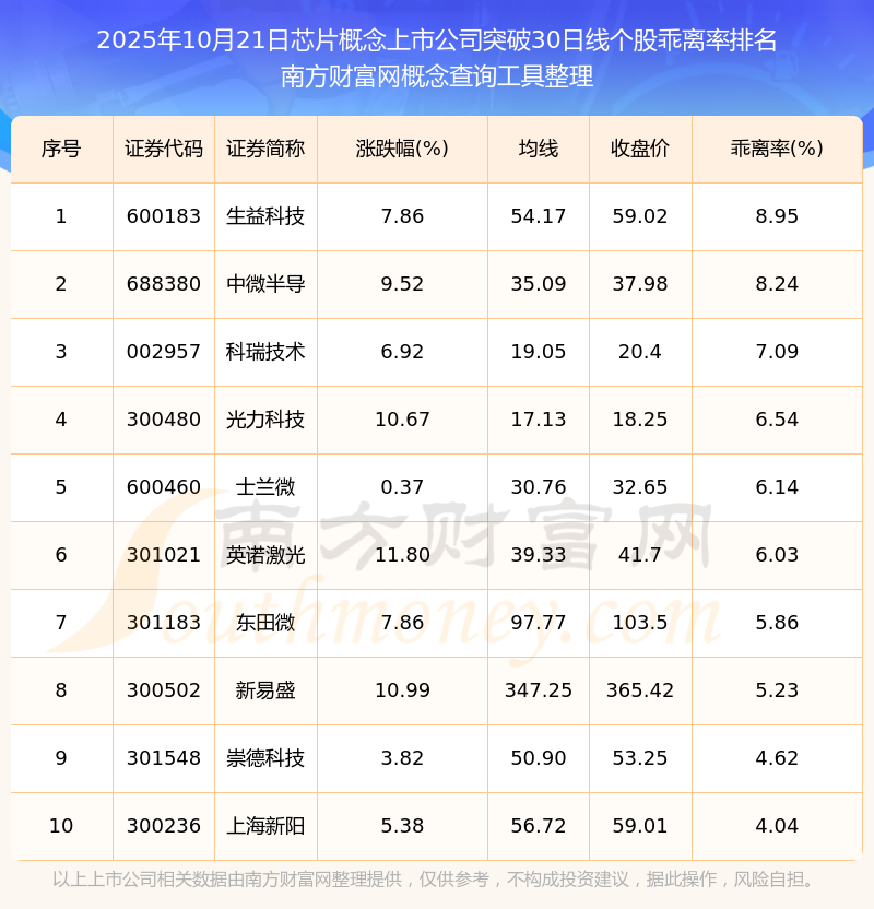 2025年10月21日芯片概念上市公司突破30日線個(gè)股乖離率排名
