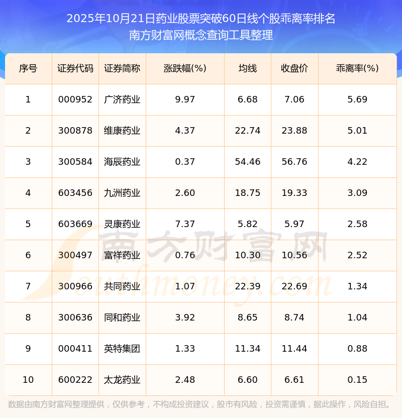 2025年10月21日藥業(yè)股票突破60日線個(gè)股乖離率排名