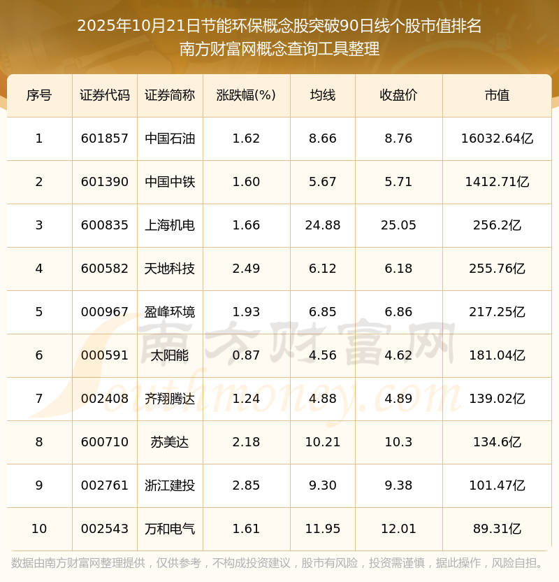 2025年10月21日節(jié)能環(huán)保概念股突破90日線個(gè)股市值排名