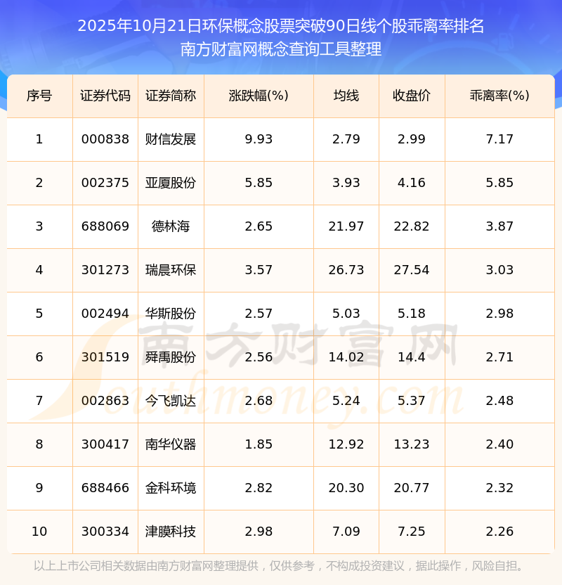 2025年10月21日環(huán)保概念股票突破90日線個股乖離率排名