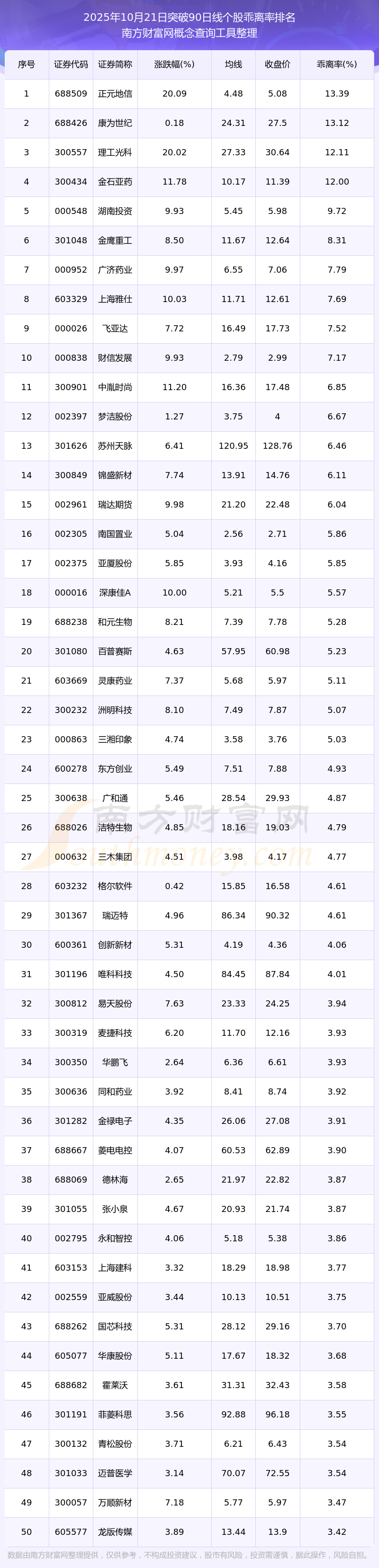 根據(jù)南方財富網(wǎng)概念查詢工具數(shù)據(jù)統(tǒng)計,截止2025年10月21日收盤,共有498只個股收盤價向上突破了90日線,其中乖離率較大的個股有正元地信、康為世紀(jì)、理工光科、金石亞藥、湖南投資等,乖離率分別為13.39%、13.12%、12.11%、12.00%、9.72%。