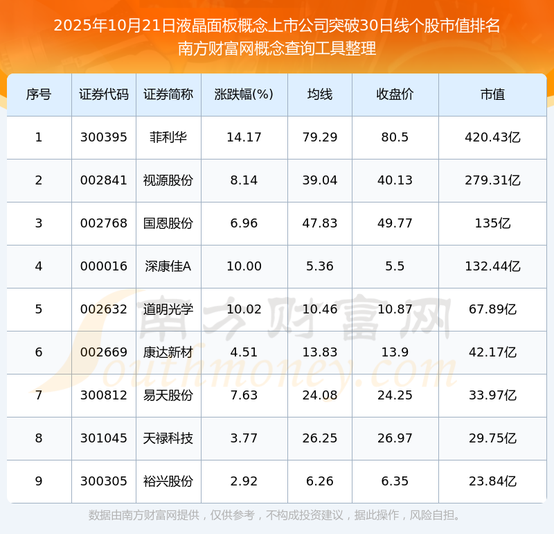 2025年10月21日液晶面板概念上市公司突破30日線個(gè)股市值排名