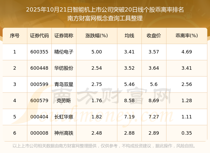 根據(jù)南方財富網(wǎng)概念查詢工具數(shù)據(jù)統(tǒng)計,截止2025年10月21日收盤,智能機上市公司共有6只個股收盤價向上突破了20日線。其中乖離率較大的個股有精倫電子、華紡股份、青島雙星等,乖離率分別為4.69%、3.41%、2.56%。