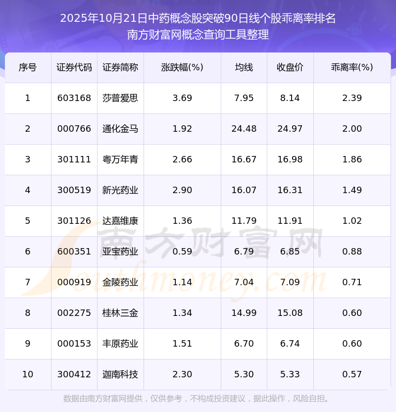 根據(jù)南方財(cái)富網(wǎng)概念查詢工具數(shù)據(jù)統(tǒng)計(jì),截止2025年10月21日收盤,中藥概念股共有17只個股收盤價向上突破了90日線。其中乖離率較大的個股有莎普愛思、通化金馬、粵萬年青等,乖離率分別為2.39%、2.00%、1.86%。