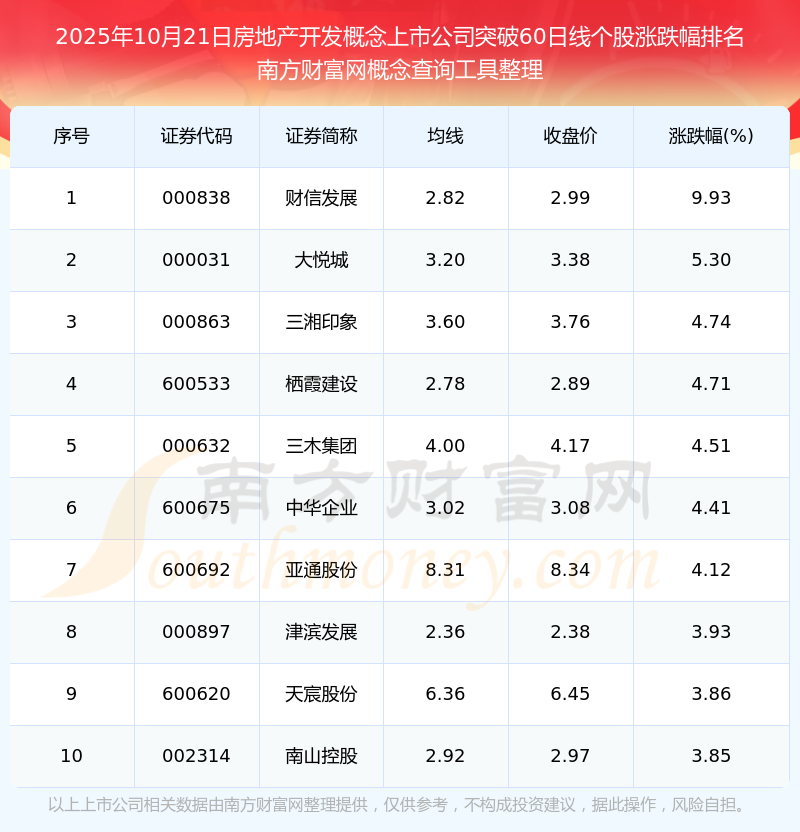 2025年10月21日房地產(chǎn)開發(fā)概念上市公司突破60日線個(gè)股漲跌幅排名