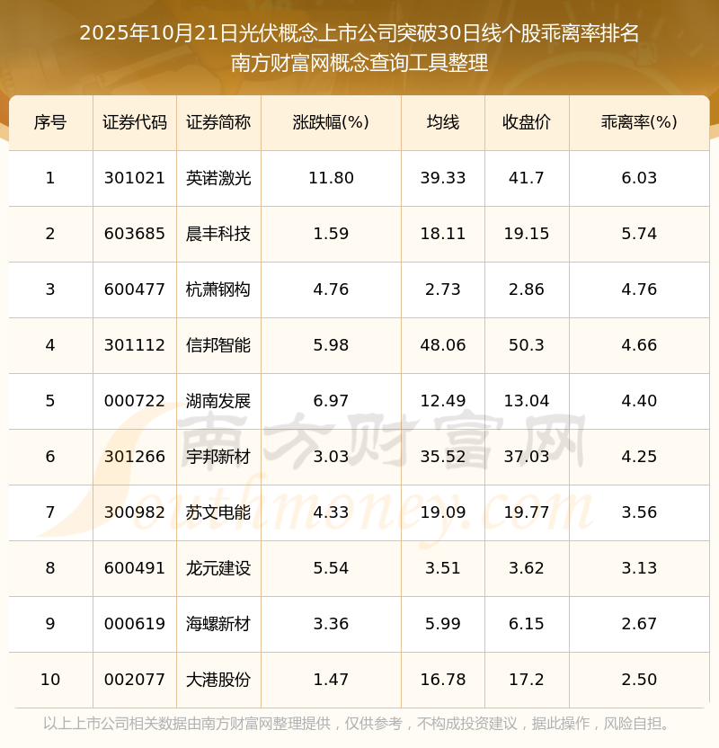 2025年10月21日光伏概念上市公司突破30日線個(gè)股乖離率排名