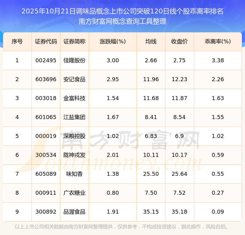2025年10月21日調味品概念上市公司突破120日線個股乖離率排名
