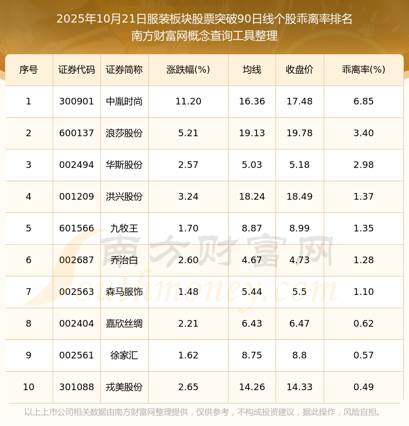 2025年10月21日服裝板塊股票突破90日線個股乖離率排名