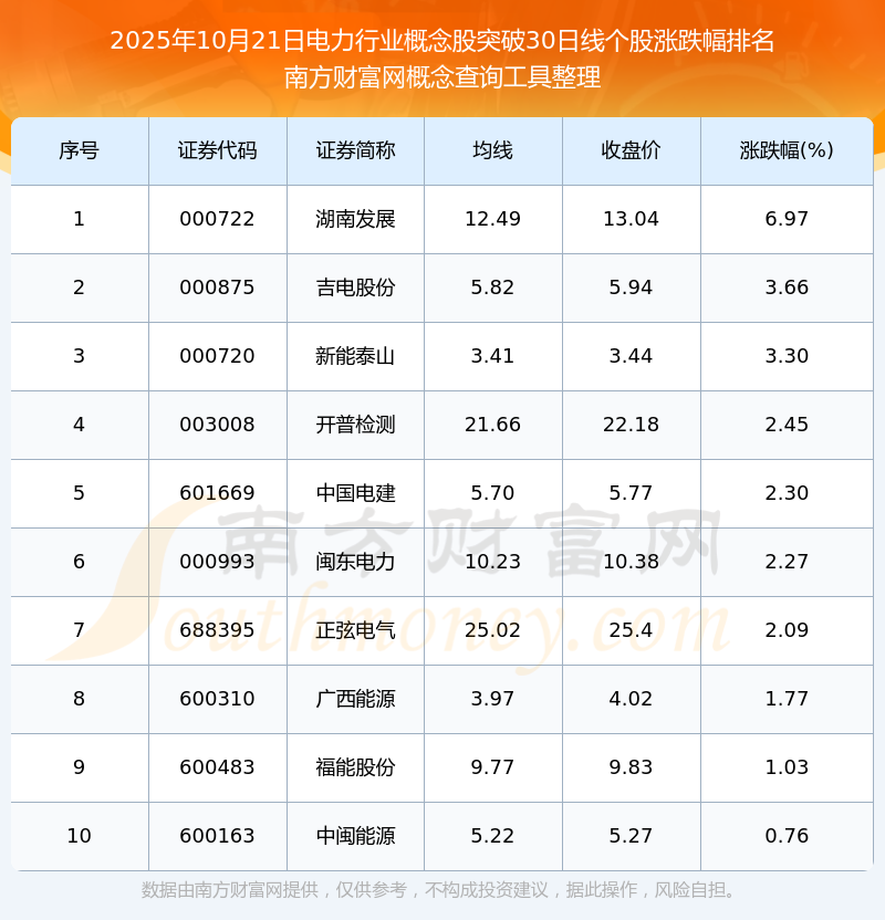 2025年10月21日電力行業(yè)概念股突破30日線個股漲跌幅排名