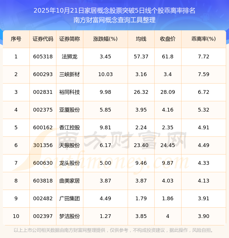 2025年10月21日家居概念股票突破5日線(xiàn)個(gè)股乖離率排名