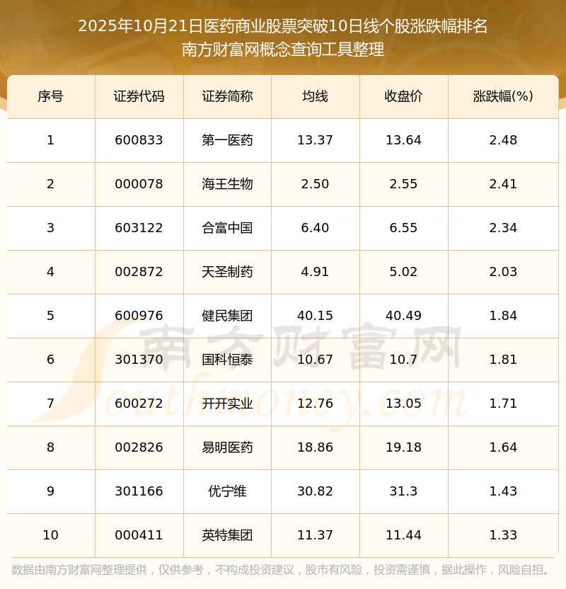 2025年10月21日醫(yī)藥商業(yè)股票突破10日線個(gè)股漲跌幅排名