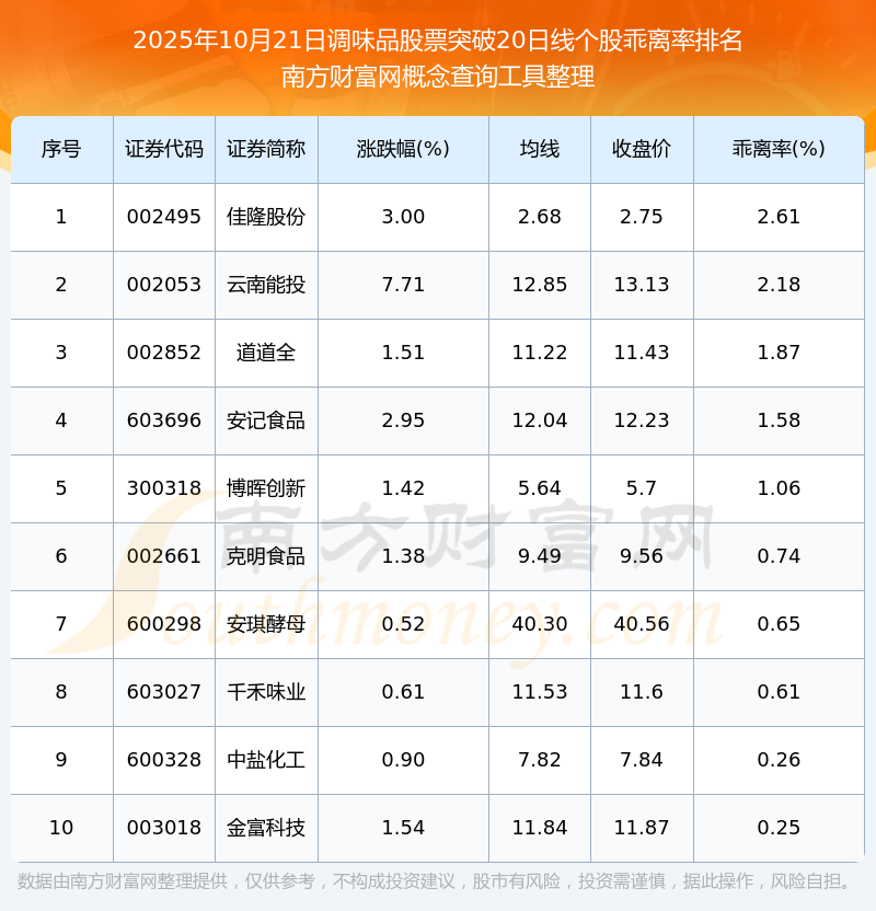 2025年10月21日調(diào)味品股票突破20日線個股乖離率排名