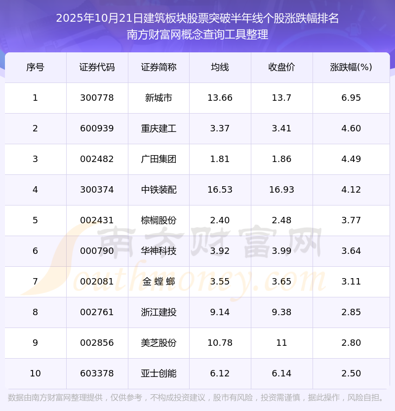 2025年10月21日建筑板塊股票突破半年線個股漲跌幅排名