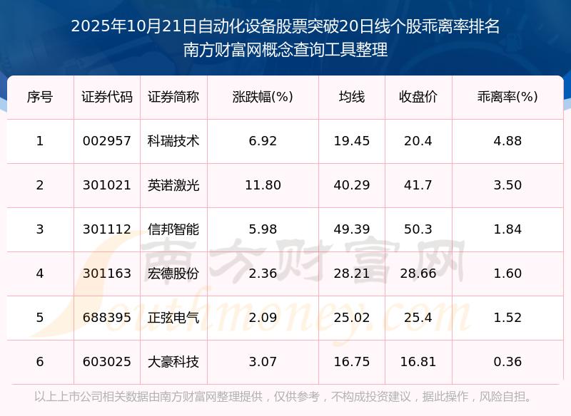 2025年10月21日自動化設(shè)備股票突破20日線個(gè)股乖離率排名